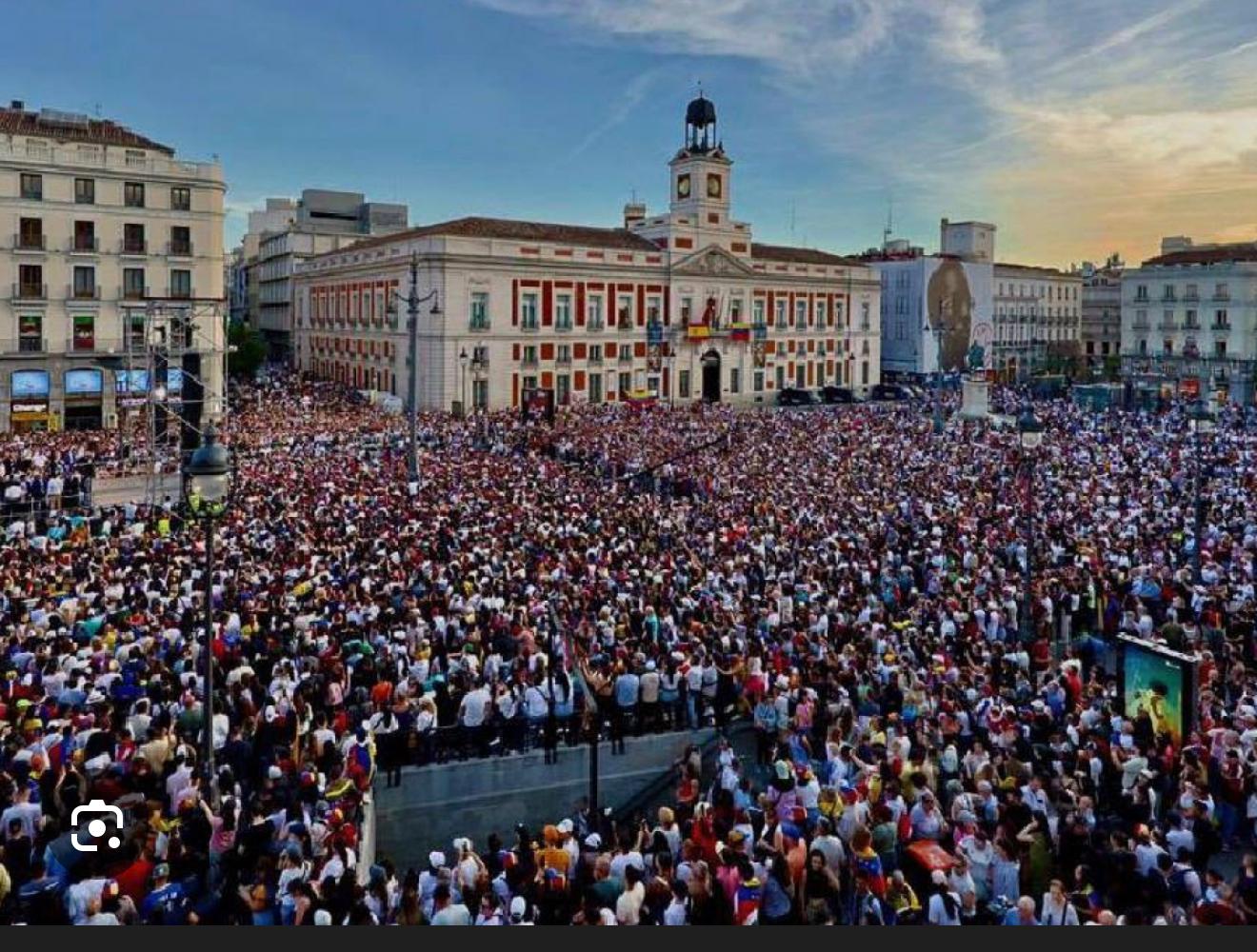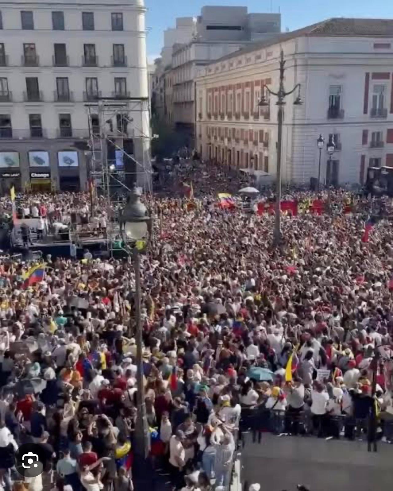 España esperaba al final, con una intensidad que ninguno anticipó del todo. El viernes 17, la Llave de Oro de Madrid de manos de Martínez-Almeida, las reuniones con Feijóo y con Ayuso. El sábado 18, la Medalla de Oro de la Comunidad y el balcón de la Real Casa de Correos sobre la Puerta del Sol. Decir "miles de venezolanos" no alcanza para describir lo que había abajo. Habían venido en autobús desde Valencia, desde Bilbao, desde Sevilla. Familias enteras. Banderas guardadas durante años esperando un momento así. Cuando María Corina dijo "hoy comienza el regreso a casa", el rugido que subió desde la plaza fue algo físico — no solo sonoro. Había gente llorando a mi lado que no se conocía entre sí, abrazándose como si se reencontrara después de mucho tiempo.
